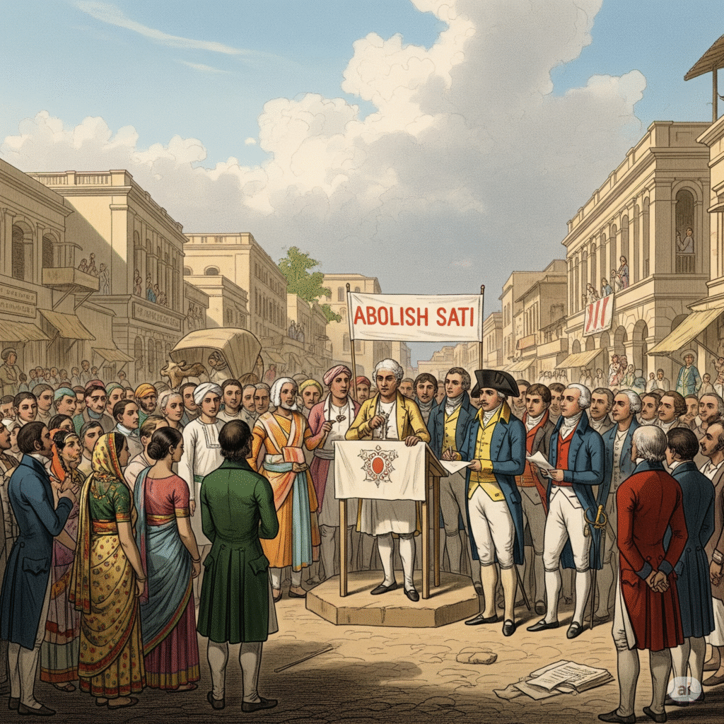 সতীদাহ প্রথা ছিল একটি প্রাচীন হিন্দু প্রথা, যেখানে একজন মৃত স্বামীর চিতায় তার বিধবা স্ত্রীকে জীবন্ত পুড়িয়ে মারা হত। এই প্রথার বিরুদ্ধে ঊনবিংশ শতাব্দীর প্রথম ভাগ থেকেই ভারতবর্ষে আন্দোলন শুরু হয়েছিল। রাজা রামমোহন রায় এই প্রথার প্রধান বিরোধী ছিলেন এবং তার প্রচেষ্টায় ব্রিটিশ সরকার ১৮২৯ সালে এই প্রথা নিষিদ্ধ ঘোষণা করে।রাজা রামমোহন রায় ছিলেন এই প্রথার বিরুদ্ধে সোচ্চার কণ্ঠ। তিনি এই প্রথার অমানবিক দিক তুলে ধরেন এবং এর বিরুদ্ধে জনমত গঠন করেন। ব্রিটিশ সরকার প্রথমে এই প্রথা বন্ধ করতে দ্বিধাগ্রস্ত ছিল, কিন্তু রামমোহন রায়ের প্রচেষ্টা এবং সমাজের সচেতনতার কারণে ১৮২৯ সালে আইন করে এই প্রথা নিষিদ্ধ ঘোষণা করে।