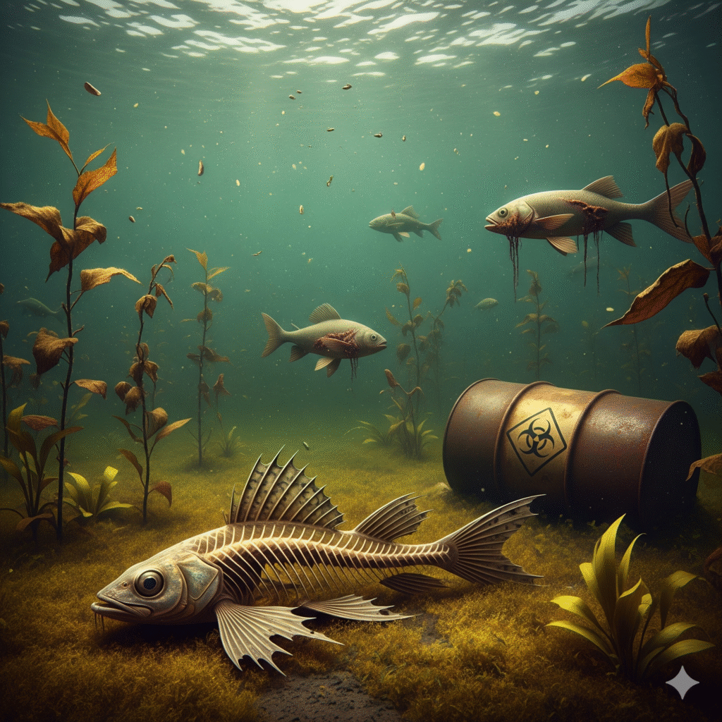 জলজ বাস্তুতন্ত্রের ওপর এর প্রভাব সুদূরপ্রসারী। শিল্পকারখানার বর্জ্য, কৃষি জমিতে ব্যবহৃত কীটনাশক ও রাসায়নিক সার জলে মিশে জলজ উদ্ভিদ ও প্রাণীর জীবনচক্র ব্যাহত করে। অতিরিক্ত পুষ্টি উপাদান (যেমন – নাইট্রেট ও ফসফেট) অ্যালগাল ব্লুম সৃষ্টি করে, যা জলের অক্সিজেনের মাত্রা কমিয়ে দেয় এবং মাছ ও অন্যান্য জলজ প্রাণীর মৃত্যুর কারণ হয়। অনেক প্রজাতি বিলুপ্তির ঝুঁকিতে পড়ে, যা সামগ্রিক জীববৈচিত্র্যের ওপর নেতিবাচক প্রভাব ফেলে।