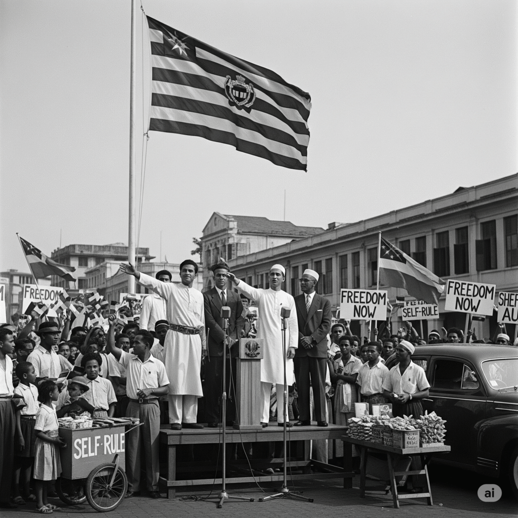 টিন ও রবারে সমৃদ্ধ মালয় ছিল ব্রিটিশ উপনিবেশ। তাই ভারতবর্ষের স্বাধীনতা দিলেও ইংরেজরা মালয়কে স্বাধীনতা দিতে রাজি ছিল না। 1948 খ্রিস্টাব্দে মালয়কে স্বায়ত্তশাসন প্রদান করা হয়। কিন্তু পূর্ণ স্বাধীনতার দাবিতে টিল্ফ রহমানের নেতৃত্বে মালয়ের মানুষ সংগ্রাম শুরু করে। 1959 খ্রিস্টাব্দে ব্রিটিশ সরকার স্বাধীনতা দিতে বাধ্য হয়। মালয়, সিঙ্গাপুর, সারওয়া ও সারা সংযুক্ত হয়ে গঠিত হয় স্বাধীন মালয়েশিয়া যুক্তরাষ্ট্র।