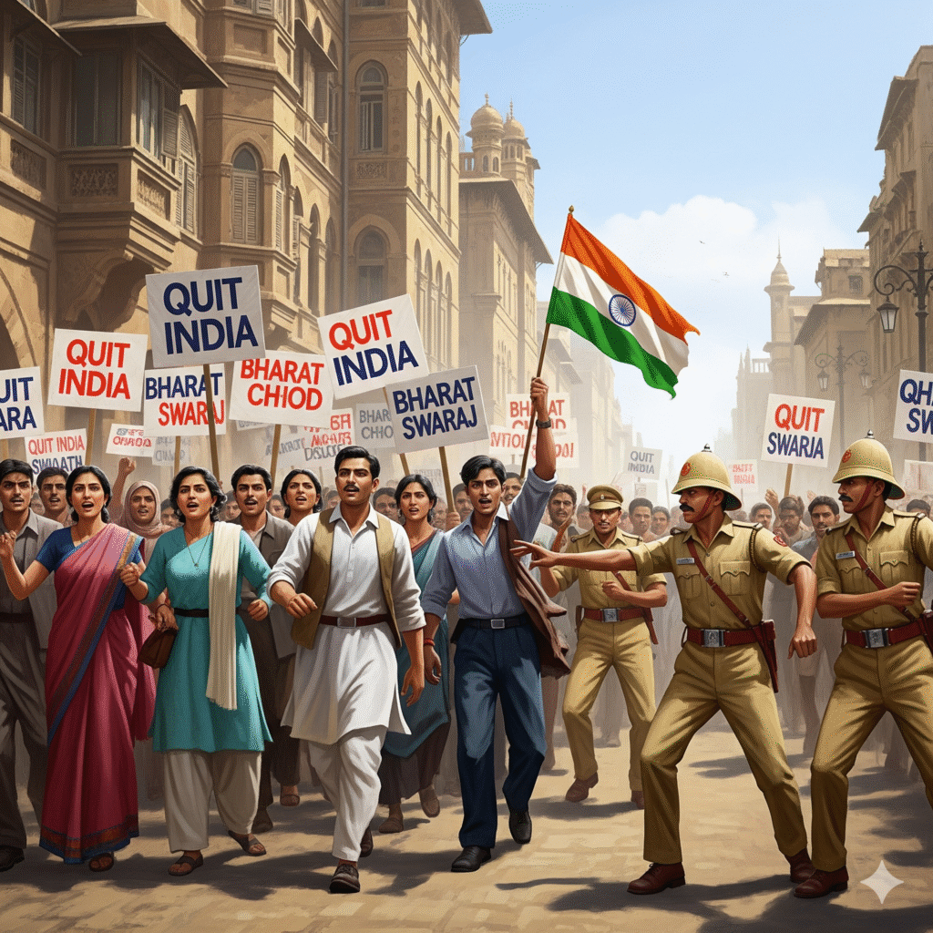 আন্দোলনের সূচনা-৮ই আগস্ট গভীর রাতে কংগ্রেসের অধিবেশন শেষ হলে, কয়েক ঘন্টার মধ্যে গান্ধিজি জওহরলাল নেহেরু, বল্লভ ভাই প্যাটেল এবং আজাদ সহ কংগ্রেসের নেতৃবৃন্দকে গ্রেপ্তার করা হয়। পরদিন ৯ আগস্ট কংগ্রেসের নেতৃবৃন্দের গ্রেপ্তারের খবর প্রকাশিত হলে দেশজোড়া স্বতঃস্ফূর্ত ভাবে হরতাল, মিছিল, বিক্ষোভএবং বিক্ষিপ্ত গণঅভ্যুত্থান শুরু হয়। নেতৃবৃন্দের অধিকাংশই তখন জেলে, জনগণকে পরিচালিত করার মতো তখন কেউ ছিল না। জনগণরা নিজেদের দ্বারাই বিদ্রোহ করতে শুরু করলো। স্কুল, কলেজ, হাসপাতাল, কারখানায় ধর্মঘট শুরু করল এবং টেলিফোন, টেলিগ্রাফের তার কাটা, রেললাইন চ্যুত করা, থানা, ডাকঘর, সরকারি অফিস আদালতগুলিতে অগ্নিসংযোগ প্রভৃতি চলতে থাকলো। দিল্লি, কোলকাতা, বোম্বাই, লক্ষ্ণৌ, কানপুর, নাগপুর, আমেদাবাদ বিক্ষুব্ধ জনতার সঙ্গে ইংরেজ সেনাবাহিনিদের সপ্তাহব্যাপী সংঘর্ষ চলল।
