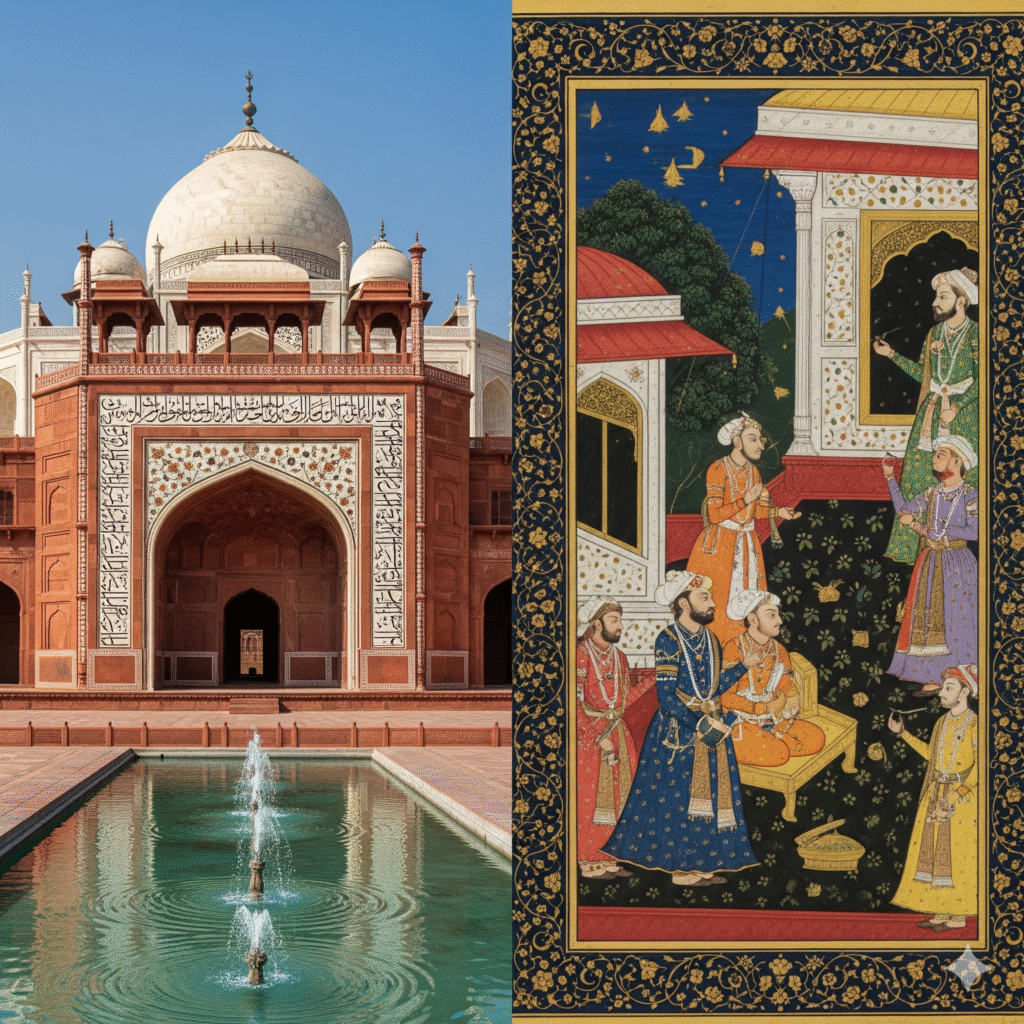 মুঘল স্থাপত্য ও চিত্রকলা 1526 – 1857, উভয়ই মুঘল সাম্রাজ্যের একটি গুরুত্বপূর্ণ দিক ছিল। মুঘল স্থাপত্যে, তাজমহল, ফতেপুর সিক্রি, এবং লাল কেল্লার মতো বিখ্যাত স্থাপত্যশৈলী দেখা যায়। এই স্থাপত্যে গম্বুজ, মিনার, এবং খিলান ব্যবহার করা হয়েছে। মুঘল চিত্রকলা, যা “মুঘল মিনিয়েচার” নামে পরিচিত, মূলত দরবারের দৃশ্য, পশুপাখি, এবং প্রাকৃতিক দৃশ্য নিয়ে গঠিত। এই চিত্রগুলোতে উজ্জ্বল রং এবং বিস্তারিত নকশা ব্যবহার করা হতো।