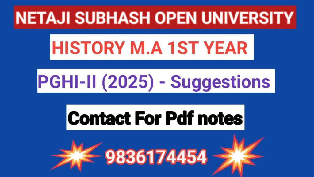 pghi suggestion 2025 2nd paper nsou m.a. The PGHI (Post Graduate History) Paper II syllabus, offered by Netaji Subhas Open University, covers the history of India under British rule and its impact on various aspects of Indian society and economy. Key topics include the impact of the Battle of Plassey and Buxar, British land revenue settlements, tribal and peasant revolts, British expansion, the 1857 revolt, changes in Indian trade and industry, the Drain of Wealth, de-industrialization, Western education, and the growth of public opinion. pghi suggestion 2025 2nd paper nsou m.a.
